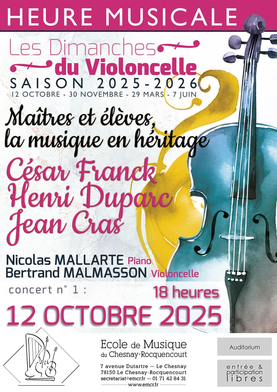 "Dimanche du Violoncelle" 1 Maîtres et élèves, la musique en héritage : César Franck, Henri Duparc, Jean Cras avec Bertrand Malmasson, Violoncelle & Nicolas Mallarte, Piano |